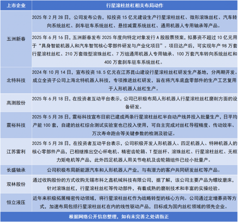近日,五洲新春、雙林股份、震裕科技、北特科技、長盛軸承等多家零部件上市公司都在加速布局轉(zhuǎn)型行星滾柱絲杠領(lǐng)域,相關(guān)企業(yè)合計規(guī)劃投資金額已超過60億元。